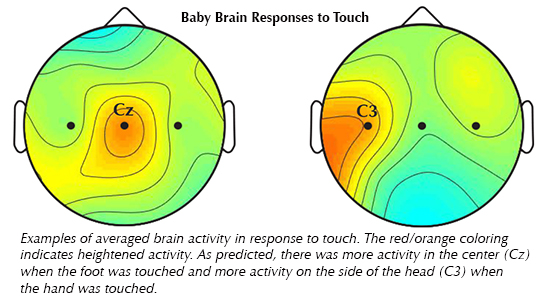 "This is an important first step in showing that the brain’s somatotopic representations of infants’ bodies can be studied with a gentle touch of the skin," Saby said.