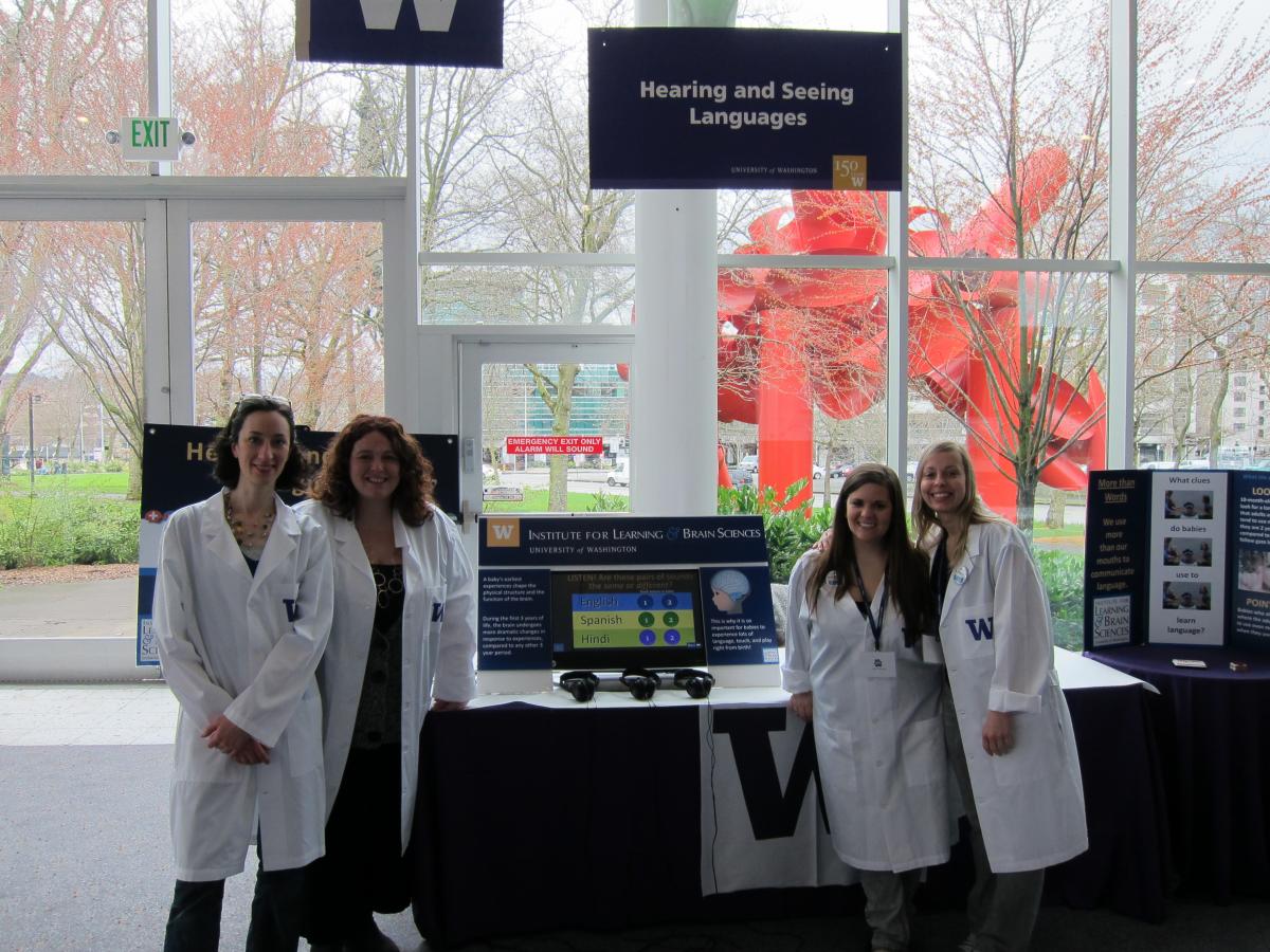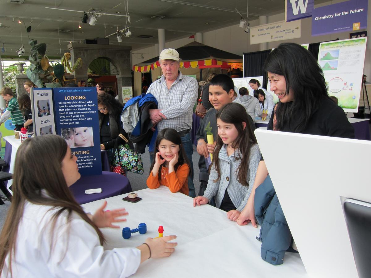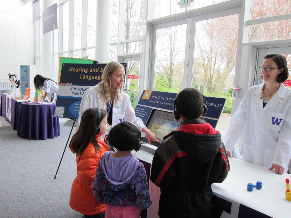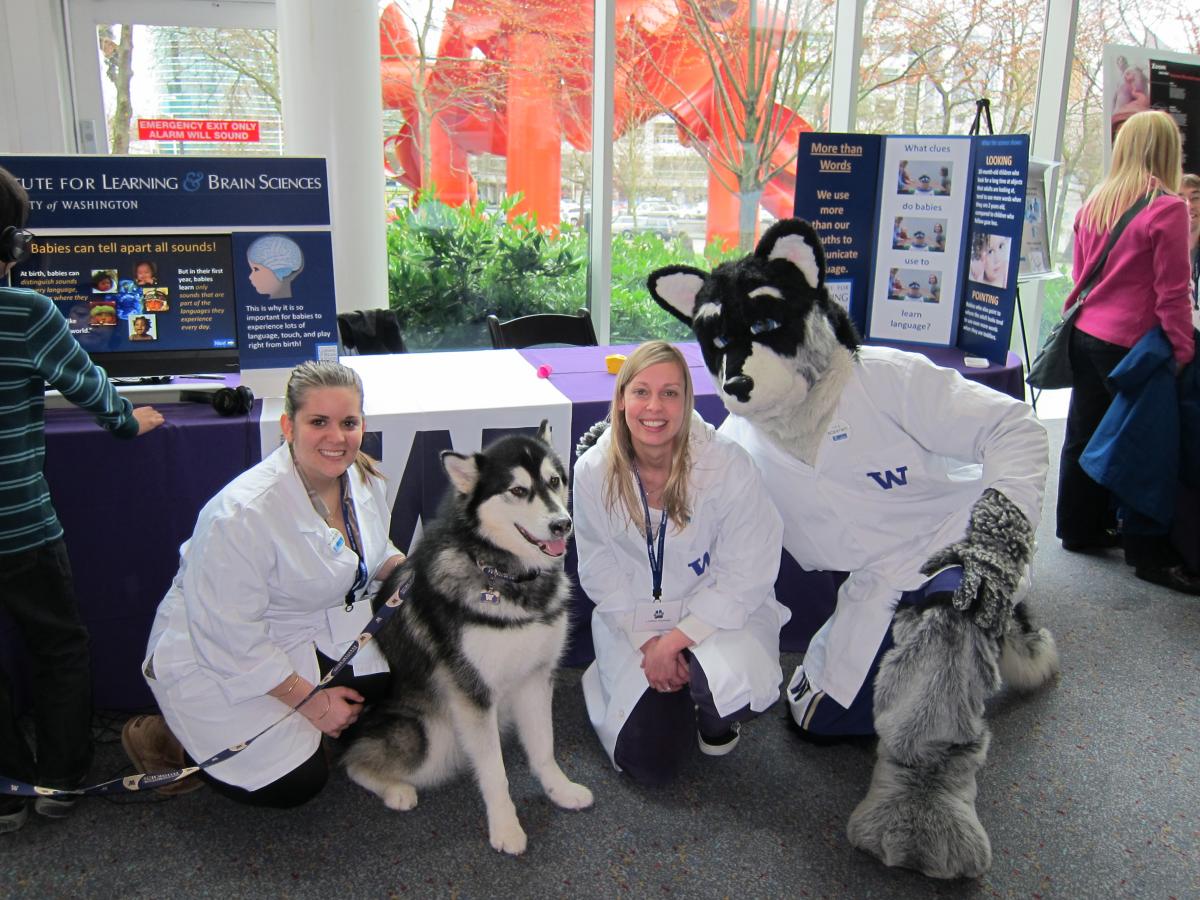 To highlight the critical role of language input and interaction, demonstrations included an interactive touch-screen where visitors of all ages could experience the effects of how the brain is "wired" and "tuned" specifically to the languages around it, starting early in life. Visitors also learned first-hand how non-verbal cues, including gesture, eye-gaze and imitation are all used by even the youngest babies to learn their first language. During the fun two-day event, young scientists and their families got to explore how brain science and early learning go together, and how they too can observe, teach, and learn from the babies in their lives. In addition to all the young scientists who came to visit our booth, we also had a chance to hang out with Dubs, Harry the Husky, and the UW Marching Band.