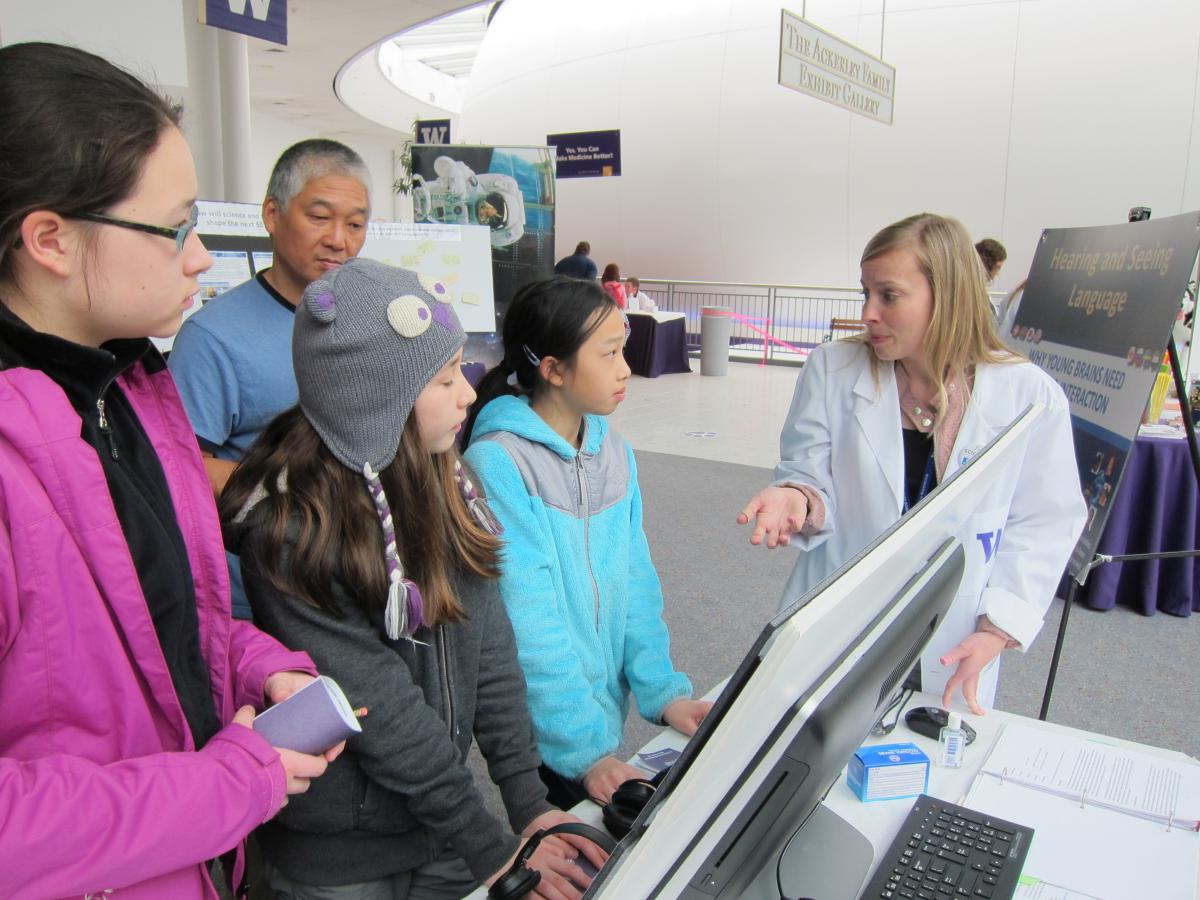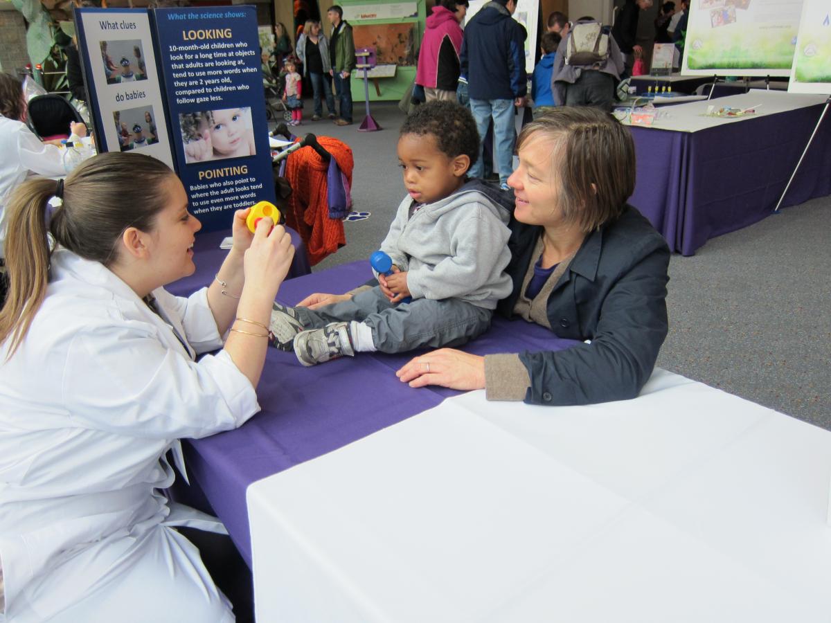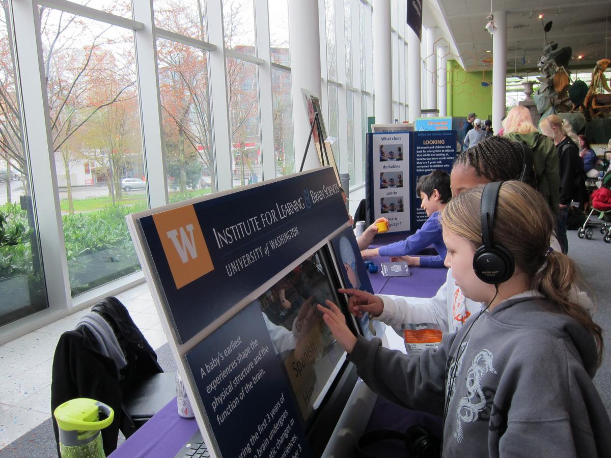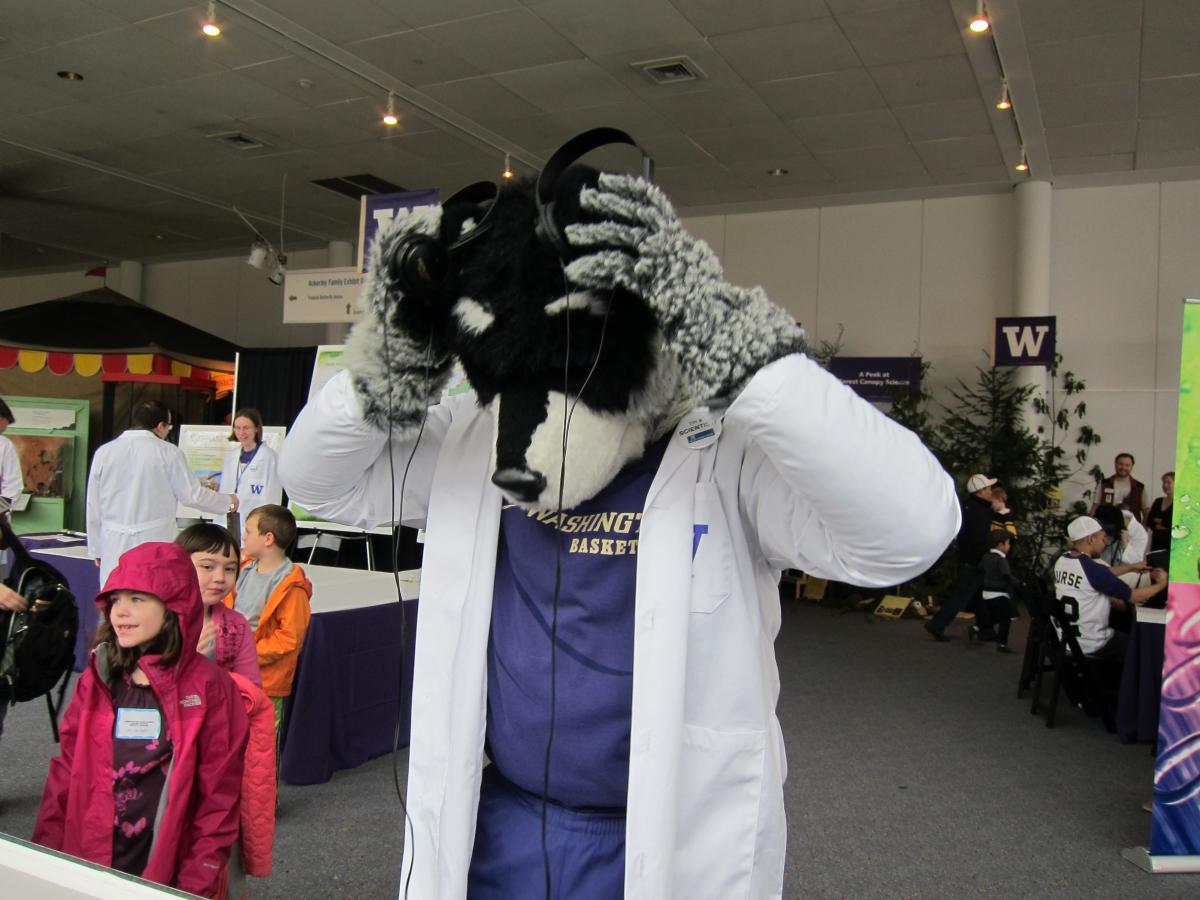 To highlight the critical role of language input and interaction, demonstrations included an interactive touch-screen where visitors of all ages could experience the effects of how the brain is "wired" and "tuned" specifically to the languages around it, starting early in life. Visitors also learned first-hand how non-verbal cues, including gesture, eye-gaze and imitation are all used by even the youngest babies to learn their first language. During the fun two-day event, young scientists and their families got to explore how brain science and early learning go together, and how they too can observe, teach, and learn from the babies in their lives. In addition to all the young scientists who came to visit our booth, we also had a chance to hang out with Dubs, Harry the Husky, and the UW Marching Band.