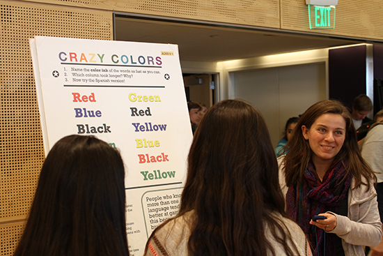 Lily Shafer, an I-LABS outreach assistant, led groups of students through variations of the Stroop test, which reveals our cognitive flexibility – or lack thereof. In the photo below, she's timing how long it takes a student to say the names of the colors when they're written in the same color (left column) and then, in contrast, how much longer it takes to say the color name when it's written in a different color ink (right column).