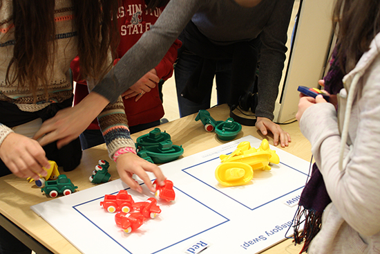 In a different version of the Stroop task, kids categorized small plastic toys based on their shape (car, boat, airplane) or color (red, yellow, green). First they had to sort by color, and then I-LABS staff switched the rule and told them to sort by shape – boats versus airplanes, for instance.