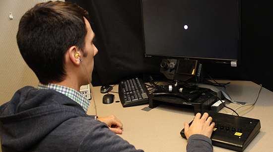 Photo caption: Participants in the experiment watched a pulsing gray disc on a black computer screen while listening to sounds through earphones. They pressed a button when they heard a brief pitch change in the target sound or when they saw a brief color change. Credit: Institute for Learning & Brain Sciences.