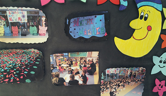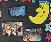 Above: A colorful bulletin board at the preschool advertises "Noche Magica," a sleepover at the school.