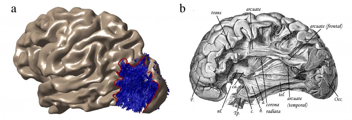 The figure below is a side by side comparison of a side view of the brain with the occipital lobe – where visual information is processed – pointing toward the right. The image on the left depicts the vertical occipital fasciculus as a bundle of blue fibers in the occipital lobe. It is taken from Yeatman and colleagues' diffusion MRI measurements. On the right is a drawing of the same region of the brain by neuroanatomist Theodor Meynert. It appears in am article published in 1892 and while it points out other prominent brain pathways, it leaves out the vertical occipital fasciculus – which would be at the far right side of this illustration, behind the layers of cortex. By covering up the VOF with cortex, "It's like Meynert was saying 'Nothing to see here,'" Yeatman joked. The VOF contradicted Meynert’s theory that all association fibers traveled from back to front rather than vertically.