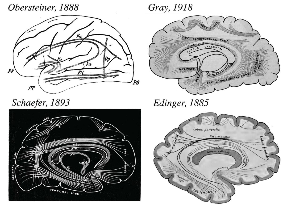 The series of images below shows drawings of brain connections that the researchers found in the various atlases they studied. Heinrich Obersteiner's 1888 camera lucida drawing (considered state-of-the-art method at the time), Sir Edward Schaefer's 1893 woodblock carving, and Gray's 1918 illustration all show the vertical occipital fasciculus. But Ludwig Edinger's 1885 drawing leaves out the fiber pathway.