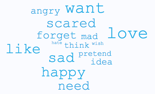 - "Mental state" words that have to do with what children know about other people's thoughts and feelings. Including words that have to do with emotions ("sad," "mad," "angry"), desires ("want," "need"), and cognition ("pretend," "think", "idea," "forget").