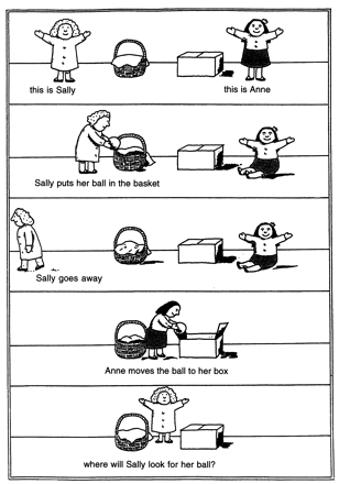 This classic "Sally/Anne" test (see diagram on the right, from the website holah.co.uk) taps into whether children can put themselves in some else's shoes and understand what other people are thinking, or "theory of mind." Can they override what they know about the world, and think about something from someone else's point of view? Do they understand that other people may have different knowledge than themselves?