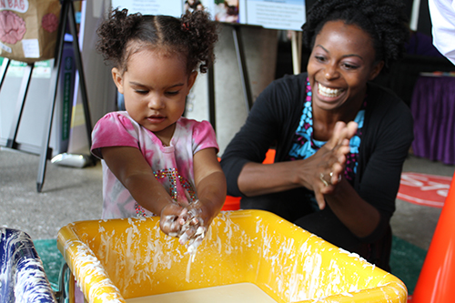 Rogers is also mom to Phoenix, shown below at age two at I-LABS exhibit's at the 2013 Seattle Science Festival. Mother and daughter were working with a water and cornstarch concoction – "oobleck" – which the I-LABS outreach team uses to demonstrate brain plasticity.